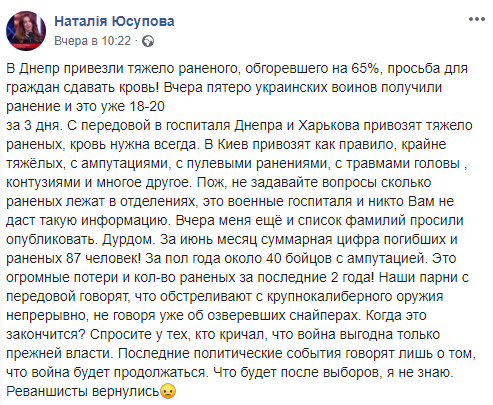 "За июнь месяц суммарная цифра погибших и раненых 87 человек. За полгода около 40 бойцов с ампутацией. Это огромные потери и количество раненых за последние 2 года. Бойцы с передовой говорят, что обстреливают из крупнокалиберного оружия непрерывно. Когда это закончится? Спросите у тех, кто кричал, что война выгодна только прежней власти. Последние политические события говорят лишь о том, что война будет продолжаться. Что будет после выборов, я не знаю. Реваншисты вернулись", – резюмировала блогер.