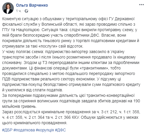 "Комментирую ситуацию с обысками в территориальном офисе ГУ Государственной фискальной службы в Волынской области, которые сейчас проводим совместно с Генпрокуратурой и Нацполицией. Ситуация такая: следователи разоблачили противоправную схему, в которой принимали непосредственное участие сотрудники ГФС. Собственно, они покрывали деятельность "теневого рынка" по торговле налоговыми кредитами и получали за такие "услуги" свой процент", – написала она.