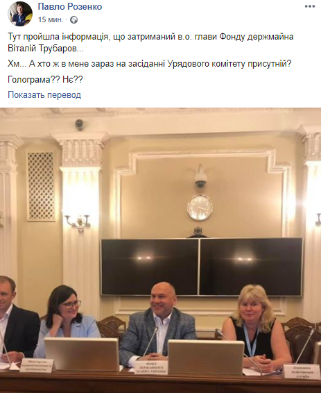 "Тут прошла информация, что задержан и.о. главы Фонда госимущества Виталий Трубаров... А кто же у меня сейчас на заседании Правительственного комитета присутствует? Голограмма? Нет?" - написал Розенко.
