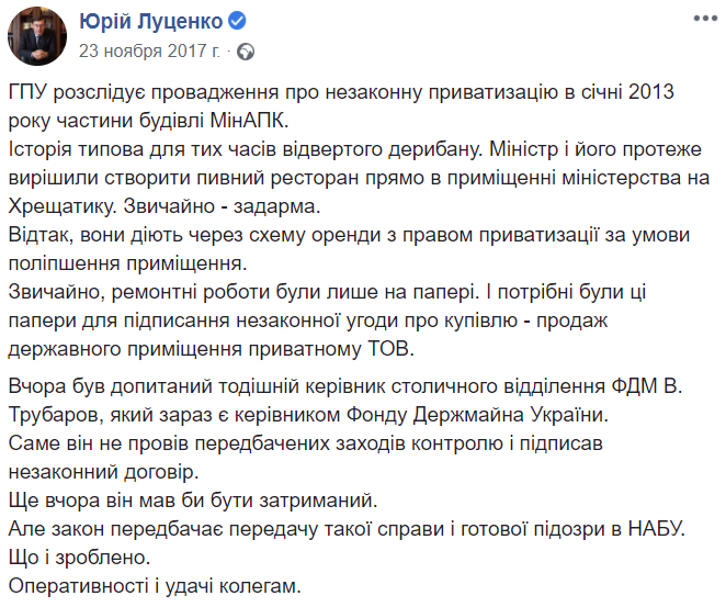 "Министр (агрополитики Николай Присяжнюк. – ред.) и его протеже решили создать пивной ресторан прямо в помещении министерства на Крещатике. Конечно, даром. Следовательно, они действуют через схему аренды с правом приватизации при условии улучшения помещения", – написал Луценко в Facebook.