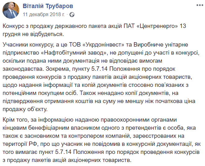 Формально власть заявляла, что нужно приватизировать эту компанию. Однако де-факто конкурс по ней срывался. В декабре 2018 года Виталий Трубаров заявил, что он отменяется - претенденты на покупку "Центрэнерго" не так оформили документы да и вообще имеют корни в России.