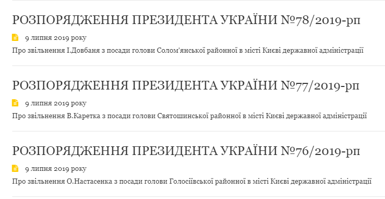Согласно распоряжениям от 9 июля 2019, Зеленский уволил главу Голосеевской РГА Александра Настасенко, главу Святошинской РГА Владимира Каретко и главу Соломенской РГА Игоря Довбаня.