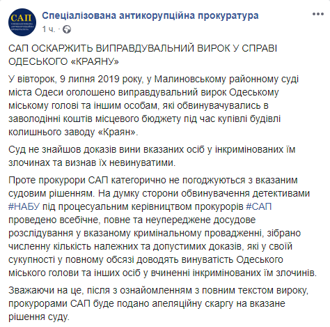 В Специализированной антикоррупционной прокуратуре (САП) решили обжаловать оправдательный приговор в деле мэра Одессы Геннадия Труханова относительно приобретения горсоветом Одессы здания бывшего завода "Краян" по завышенной стоимости. Об этом сообщает пресс-служба САП в Facebook.