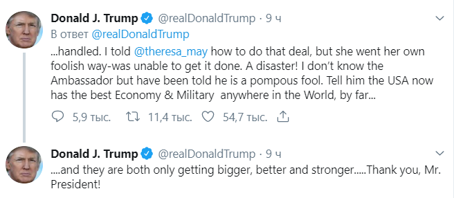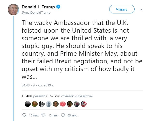 "Дурацкий посол, которого Великобритания навязала Соединенным Штатам, не тот человек, от которого мы в восторге, а очень глупый парень. Он должен поговорить со своей страной и премьер-министром Мэй об их провальных переговорах по Брекситу, и не расстраиваться из-за моей критики о том, как плохо они с этим справились", написал Трамп.