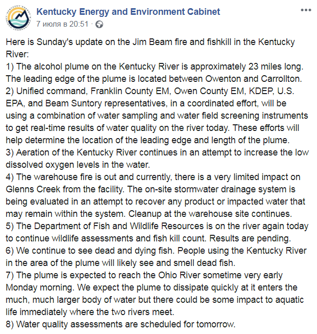 Алкоголь попал в реки Кентукки и Гленнс-Крик. Это спровоцировало падение уровня кислорода в воде, что и привело к массовой гибели рыбы. Точные масштабы бедствия пока не известны. Однако эксперты утверждают, что погибнуть могли тысячи особей, уверяют в департаменте охраны дикой природы правительства Кентукки.