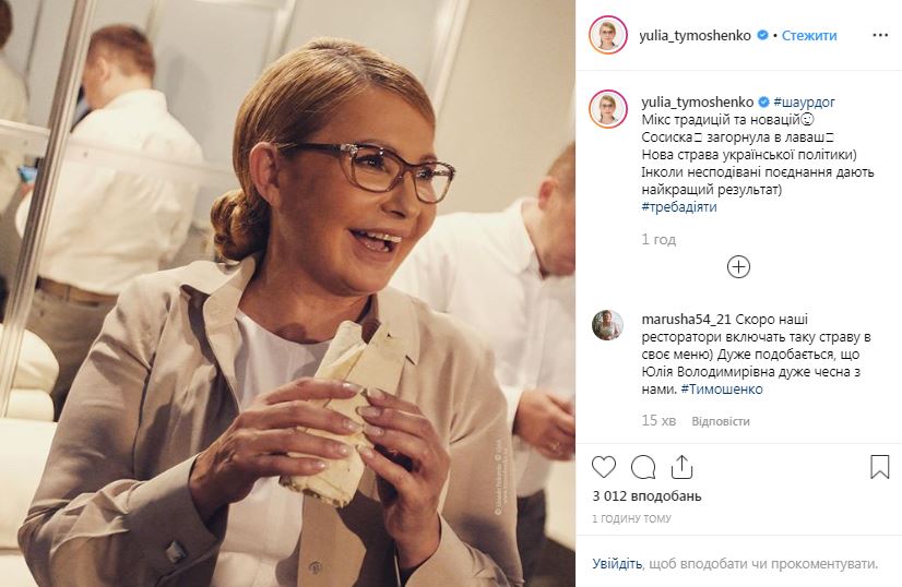 Так, она сфотографировалась с "шаурдогом" и запостила фото в своем Instagram. "Шаурдог. Микс традиций и новаций. Сосиску завернула в лаваш). Новое блюдо украинской политики) Иногда неожиданные сочетания дают лучший результат)", - написала Тимошенко.