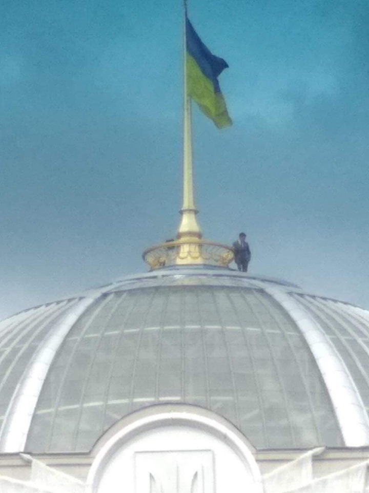 В сети появились снимки человека, похожего на президента Владимира Зеленского, который находится на куполе здания Верховной Рады и что-то снимает на телефон. Фото опубликовал блогер Михаил Голуб в Facebook.