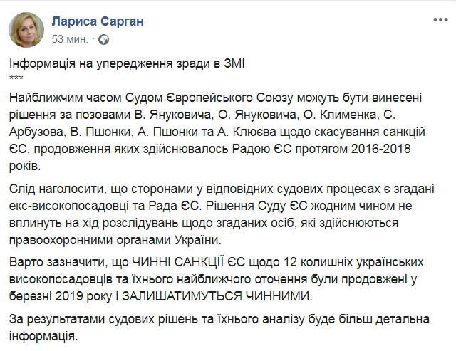 "В ближайшее время Судом Европейского Союза могут быть вынесены решения по искам В.Януковича, А.Януковича (сын экс-президента Александр - прим. ред.), А.Клименко (экс-глава Миндоходов Александр Клименко - прим. ред.), С.Арбузова (бывший первый вице-премьер Сергей Арбузов - прим. ред.), В.Пшонки, А.Пшонки (экс-генпрокурор Виктор Пшонка и его сын Артем – прим. ред.) и А.Клюева (экс-глава администрации Януковича Андрей Клюев – прим. ред.) об отмене санкций ЕС, продолжение которых осуществлялось Советом ЕС в течение 2016-2018 годов", - написала Сарган.
