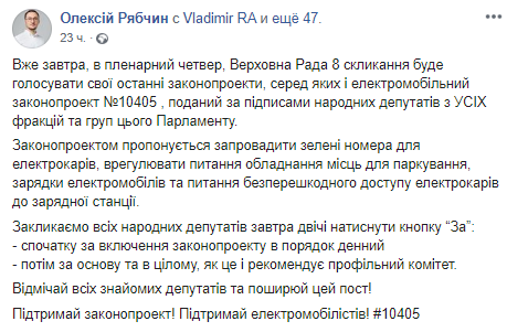"Законопроектом предлагается ввести зеленые номера для электрокаров, урегулировать вопрос оборудования мест для парковки, зарядки электромобилей и вопрос беспрепятственного доступа электрокаров к зарядной станции", - написал автор законопроекта, нардеп от "Батькивщины" Алексей Рябчин на странице в Facebook.