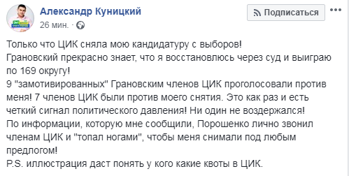 "Следовательно, комиссия частично удовлетворила указанную жалобу и отменила регистрацию кандидата в народные депутаты Украины Куницкого, выдвинутого политической партией "Слуга народа", в округе №169 на внеочередных выборах народных депутатов Украины 21 июля 2019 года", - сообщили в ЦИК.