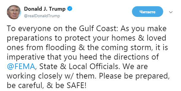 Трамп призвал жителей штата прислушиваться к предупреждениям местных властей и к осторожности. "Так как вы готовитесь защищать свои дома и близких от наводнения и приближающегося шторма, очень важно прислушиваться к указаниям федеральных, государственных и местных органов власти. Мы находимся с ними в тесном контакте. Пожалуйста, будьте подготовленными, аккуратными и в безопасности!" - говорится в его твиттер-микроблоге.