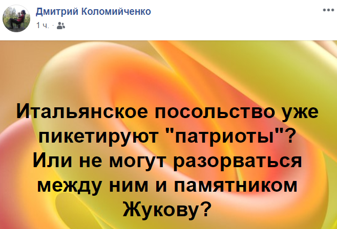 "Итальянское посольство уже пикетируют "патриоты"? Или не могут разорваться между ним и памятником Жукову?", - интересуется блогер Дмитрий Коломийченко.