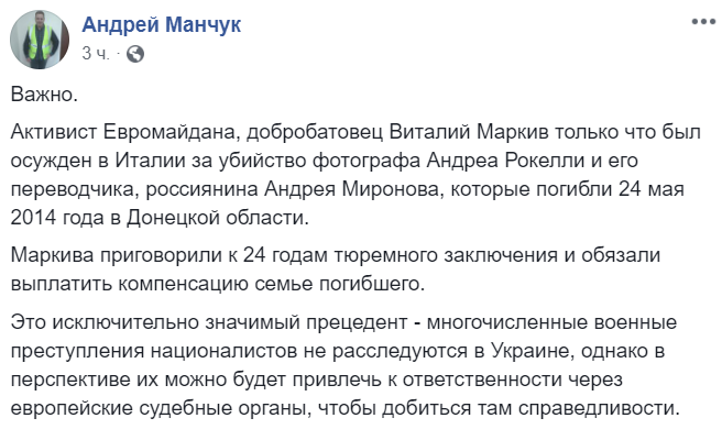 В Италии суд приговорил бывшего АТОшника Виталия Маркива к 24 годам тюрьмы. Его обвинили в убийстве итальянского фотожурналиста Андреа Роккелли во время боев за Славянск.