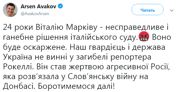 "24 года Виталию Маркиву - несправедливое и позорное решение итальянского суда. Оно будет обжаловано", - пообещал министр. В своем сообщении он использовал эмоджи, изображающее нецензурную брань.
