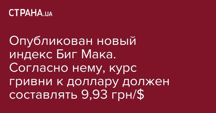 В начале года по индексу Биг Мака украинская валюта была недооценена на 65,2%. Уточняется, что руководство по тому, находятся ли валюты на "правильном" уровне, основано на теории паритета покупательной способности, который предполагает, что в долгосрочной перспективе обменные курсы должны двигаться в направлении курса, который уравнял бы цены на идентичную корзину товаров и услуг (в данном случае, бургер) в любых двух странах.