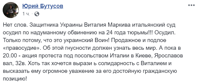 "Нет слов. Защитника Украины Виталия Маркива итальянский суд осудил по надуманному обвинению на 24 года тюрьмы!!! Осудил. Только потому, что это украинский Воин! Продажное и подлое "правосудие". Об этой гнусности должен узнать весь мир. А пока в 20.00 - акция протеста под посольством Италии в Киеве, Ярославов вал, 32в. Хоть так хочется вырази ь солидарность с Виталием и высказать ему огромное уважение за его достойную гражданскую позицию!".