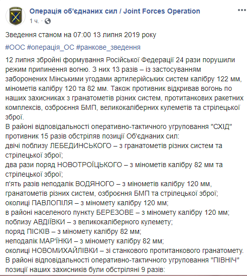 На Донбассе в зоне проведения ООС за минувшие сутки с 12 июля противник 24 раза проводили обстрел позиций ВСУ. Об этом сообщает пресс-центр штаба в Facebook.