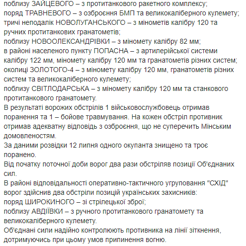 В результате обстрелов один боец ВСУ получил ранение, еще один - боевую травму. По данным разведки, один сепаратист погиб и трое ранены.