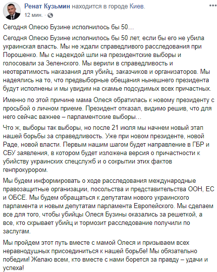 "Сегодня Олесю Бузине исполнилось бы 50 лет, если бы его не убила украинская власть. Мы не ждали справедливого расследования при Порошенко. Мы с надеждой шли на президентские выборы и голосовали за Зеленского. Мы верили в справедливость и неотвратимость наказания для убийц, заказчиков и организаторов. Мы надеялись на то, что предвыборные обещания нынешнего президента будут исполнены и мы увидим на скамье подсудимых всех причастных", - написал он.