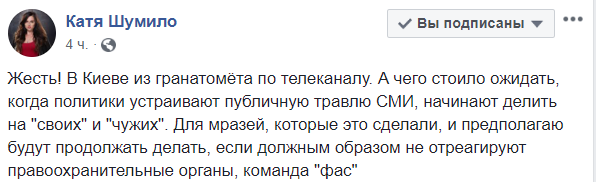 "Жесть! В Киеве из гранатомёта по телеканалу. А чего стоило ожидать, когда политики устраивают публичную травлю СМИ, начинают делить на "своих" и "чужих". Для мразей, которые это сделали, и предполагаю будут продолжать делать, если должным образом не отреагируют правоохранительные органы, команда "фас", - пишет журналистка Катя Шумило.