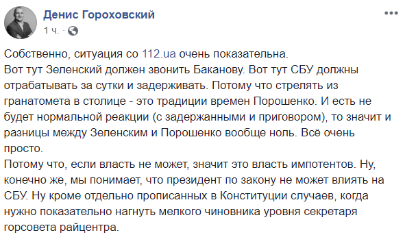 "Вчера NEWSONE подвергся давлению радикалов и их поддержал президент. Сегодня окрыленные президентской поддержкой радикалы уже 112.ua из гранатомёта расстреляли. Тоже поддержите, Владимир? Так завтра радикалы и вас расстреляют. Они ведь у нас есть власть, а вы — так ото, громко поговорить лишь", - говорит блогер Александр Скубченко.