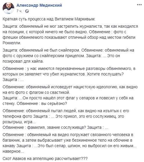 Журналист Александр Мединский опубликовал краткое содержание судебного процесса над Виталием Маркивым, признанным итальянским судом виновным в убийстве журналиста на Донбассе. Суд приговорил его к 24 годам тюрьмы.