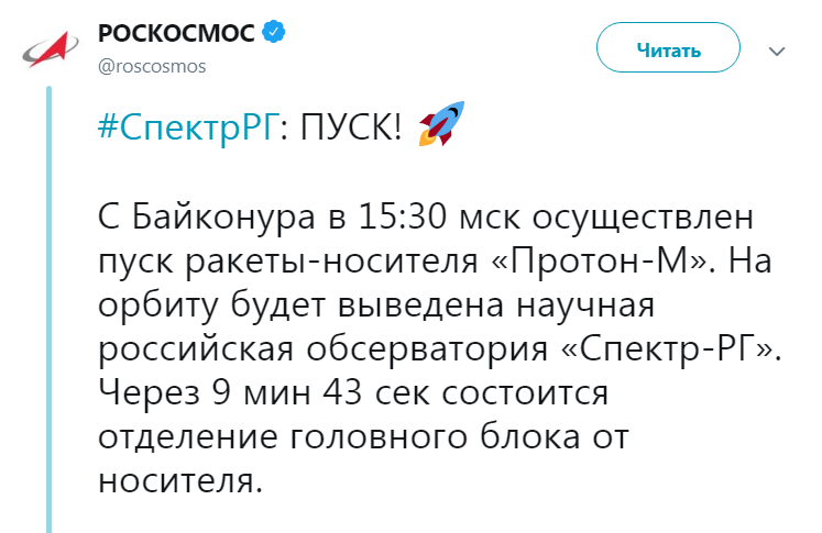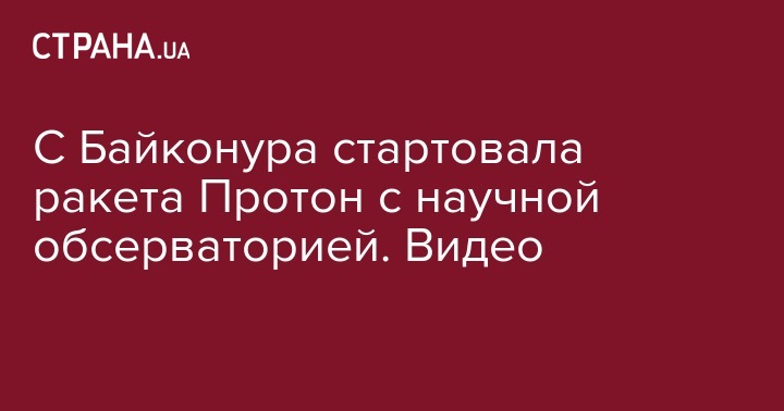 В 15:31 по Киеву с космодрома Байконур стартовала ракета "Протон-М", которая выведет в космос астрофизическую обсерваторию "Спектр-РГ". Об этом сообщил официальный Twitter "Роскосмоса".