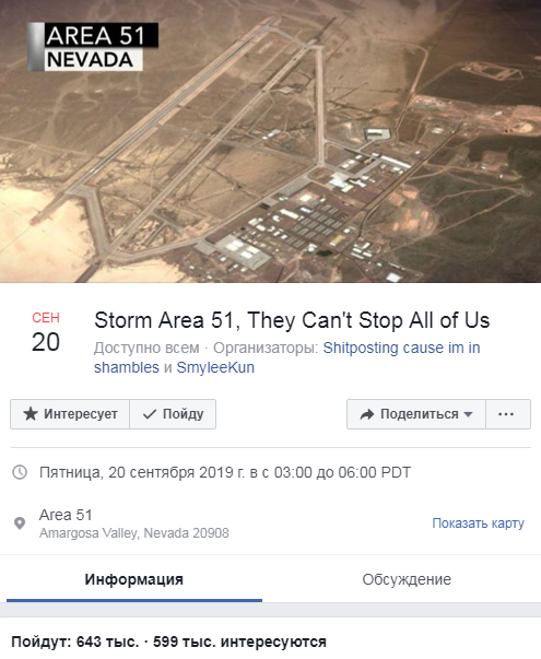 "Мы все встретимся у туристического места Alien Center Зоны 51 и скоординируем наш вход", - пишут организаторы. На данный момент более 600 тысяч человек заявили, что примут участие в мероприятии, и ещё 592 тысячи проявили к нему интерес. Мероприятие запланировано на 20 сентября.