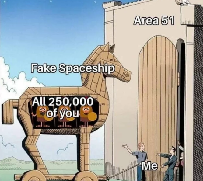 Пользователям соцсети в шутку предложили собраться в туристической точке, связанной с "Зоной 51" (в Неваде многие заведения неподалёку обыгрывают конспирологические теории), а затем просто "побежать толпой". Так, утверждают организаторы, больше шансов, что кто-то выживет и увидит пришельцев своими глазами.
