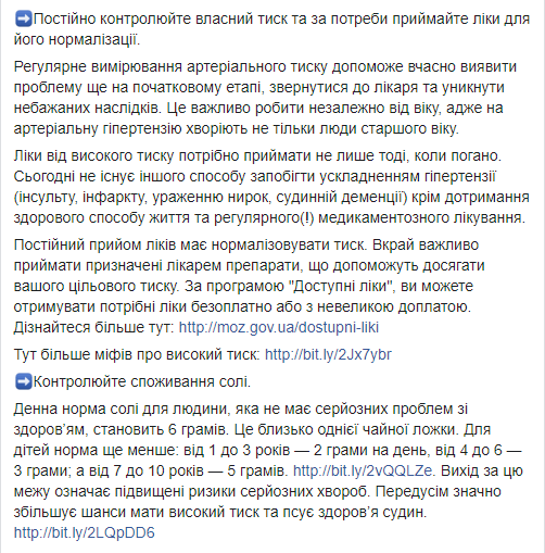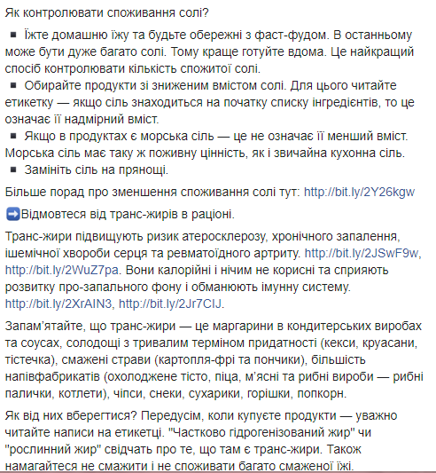 И.о. министра здравоохранения Ульяна Супрун в Facebook дала советы, как сохранить здоровье и избежать преждевременной смерти. Глава Минздрава рассказала, что нужно следить за давлением, уменьшить употребление соли и отказаться от транс-жиров.