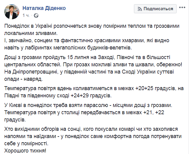 Первый день новой рабочей недели в Украине обещает быть теплым, но немного дождливым. Об этом пишет на своей Facebook синоптик Наталья Диденко.