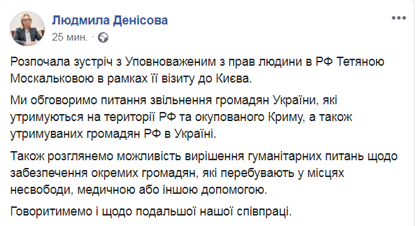 "Начала встречу с уполномоченным по правам человека в РФ Татьяной Москальковой в рамках ее визита в Киев. Мы обсудим вопрос освобождения граждан Украины, которые содержатся на территории РФ и оккупированного Крыма, а также содержащихся граждан РФ в Украине", - написала Денисова на своей странице в Facebook.