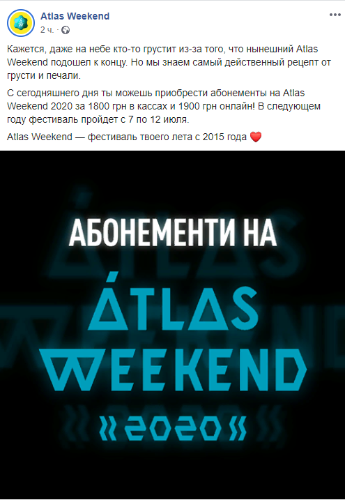 "Кажется, даже на небе кто-то грустит из-за того, что нынешний Atlas Weekend подошел к концу. Но мы знаем самый действенный рецепт от грусти и печали. С сегодня ты можешь приобрести абонементы на Atlas Weekend - 2020 за 1800 грн в кассах и 1900 грн онлайн", - говорится в сообщении.