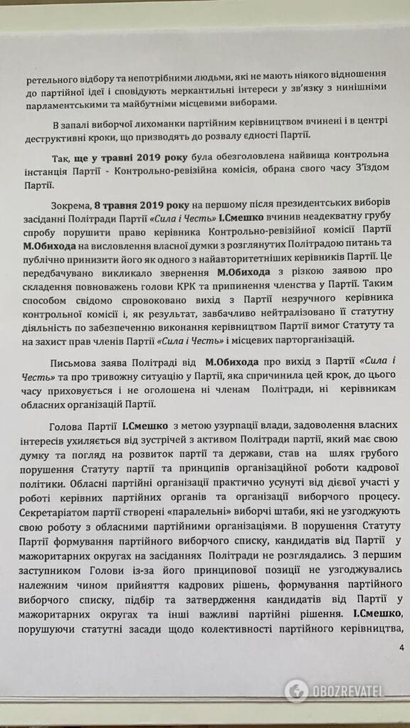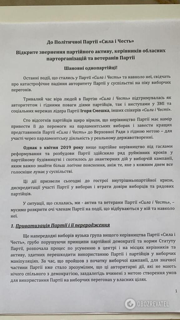 В партии Игоря Смешко "Сила и честь" продолжается крупный скандал, связанный с тем, что первые места в списке на внеочередные парламентские выборы 2019 года были проданы полностью "чужим" людям, которые никакого отношения к ней ранее не имели, пишет Обозреватель.