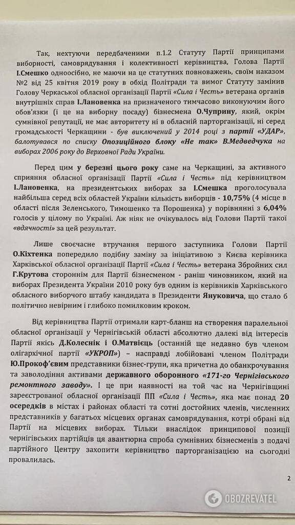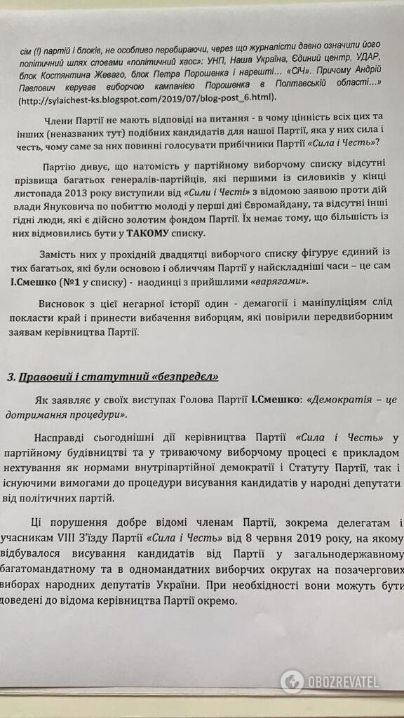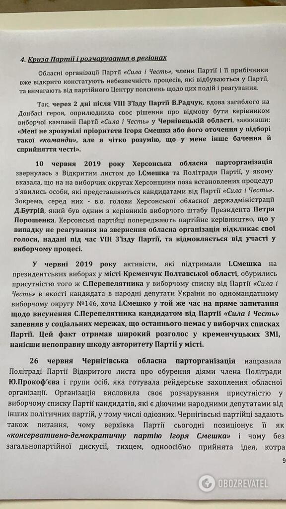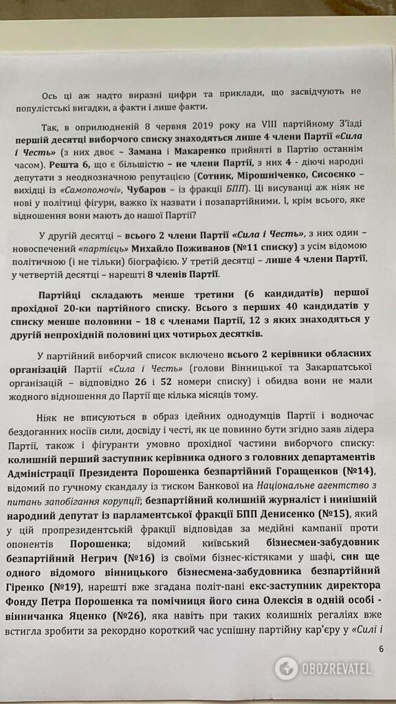 В партии "Сила и честь" Смешко разгорается скандал из-за проданных мест в списках. Документ