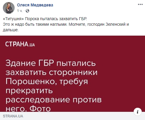 Так, журналистка Олеся Медведева сделала на этом акцент: "Титушня" Пороха пыталась захватить ГБР. Это ж надо быть такими наглыми. Молчите, господин Зеленский и дальше".