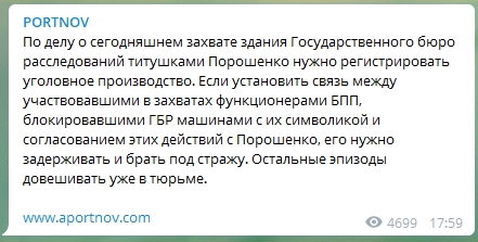 "По делу о сегодняшнем захвате здания Государственного бюро расследований титушками Порошенко нужно регистрировать уголовное производство. Если установить связь между участвовавшими в захватах функционерами БПП, блокировавшими ГБР машинами с их символикой и согласованием этих действий с Порошенко, его нужно задерживать и брать под стражу. Остальные эпизоды довешивать уже в тюрьме".