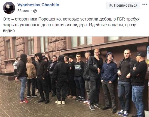 Журналист Вячеслав Чечило обращает внимание на внешний вид активистов: "Это – сторонники Порошенко, которые устроили дебош в ГБР, требуя закрыть уголовные дела против их лидера. Идейные пацаны, сразу видно".
