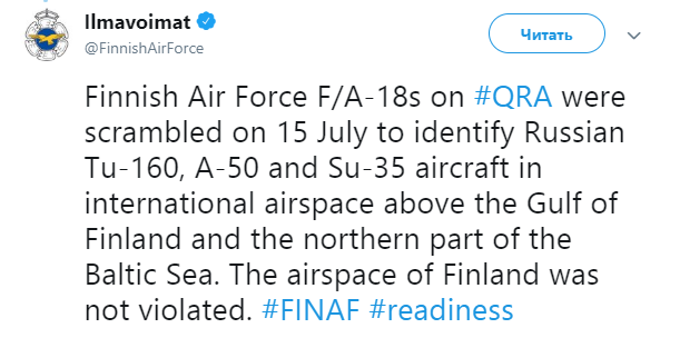 "15 июля истребители F/A-18 Hornet были подняты для идентификации российских самолетов Ту-160, А-50 и Су-35 в международном воздушном пространстве над Финским заливом и северной частью Балтийского моря. Воздушное пространство Финляндии нарушено не было", - говорится в сообщении.