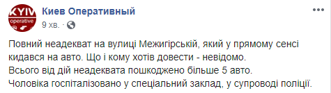 При этом пострадали пять автомобилей, говорится в сообщении Киев оперативный в Facebook. Свидетели вызвали полицию и мужчину госпитализировали в специальное учреждение.
