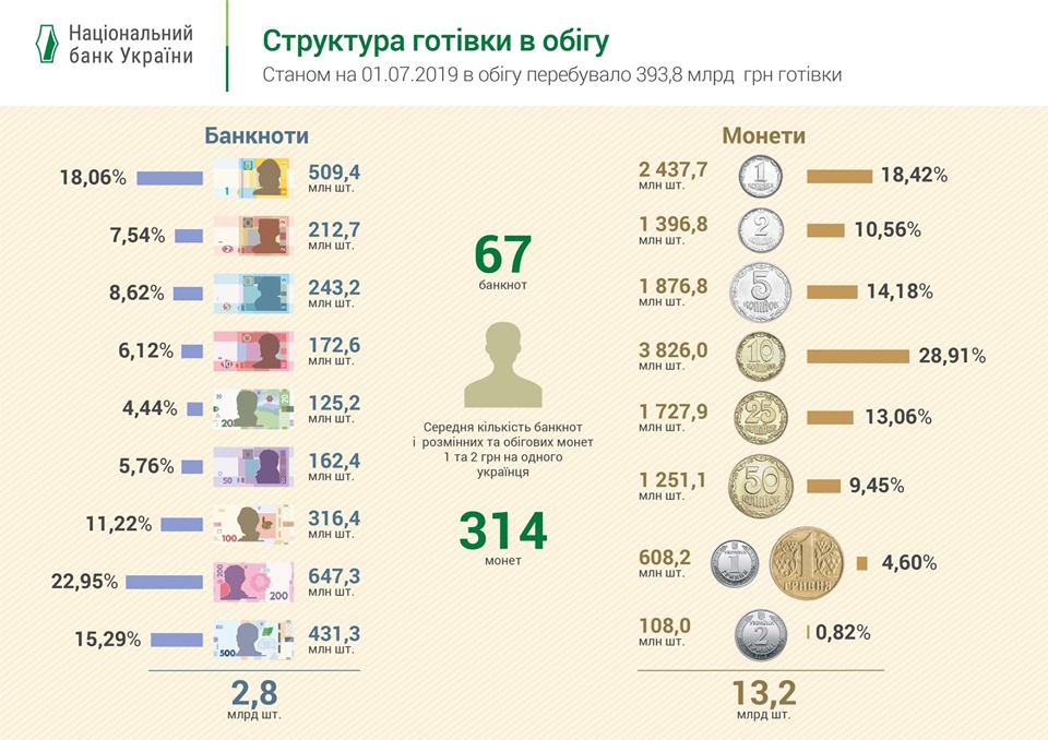 Как отмечает НБУ, в наличном обращении страны по состоянию на начало июля находилось наличности на общую сумму 393,8 млрд грн. В частности, банкнот - на сумму 391,3 млрд грн (2, млрд шт.) и монет - 2,4 млрд грн (13,2 млрд шт.).