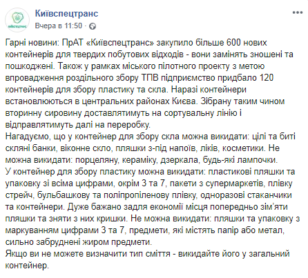 "Хорошие новости: ЗАО "Киевспецтранс" закупило более 600 новых контейнеров для твердых бытовых отходов - они заменят изношенные и поврежденные. Также в рамках городского пилотного проекта с целью внедрения раздельного сбора ТБО предприятие приобрело 120 контейнеров для сбора пластика и стекла...", - сказано в сообщении.