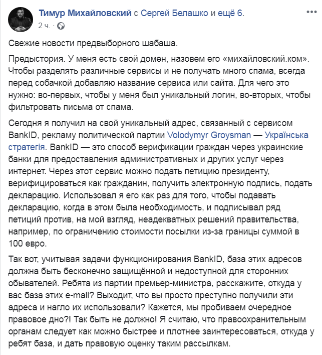 "Так вот, учитывая задачи функционирования BankID, база этих адресов должна быть бесконечно защищённой и недоступной для сторонних обывателей. Ребята из партии премьер-министра, расскажите, откуда у вас база этих e-mail? Выходит, что вы просто преступно получили эти адреса и нагло их использовали?" - обращается к однопартийцам премьера Михайловский.