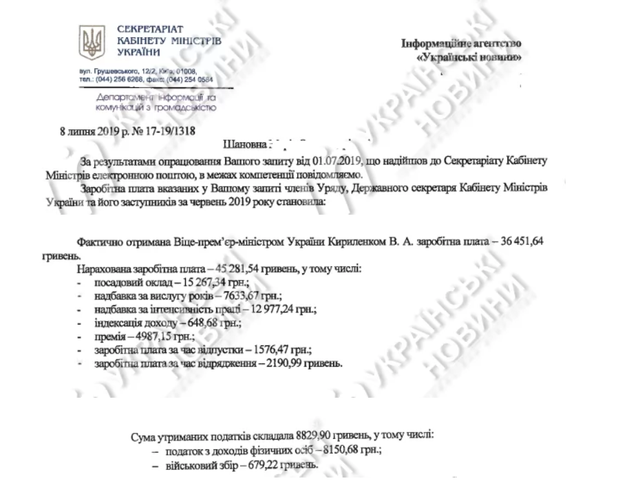Сумма удержанных налогов составила 8 830 гривен. Фактическая сумма, полученная вице-премьером на руки, составила 36 452 гривны.