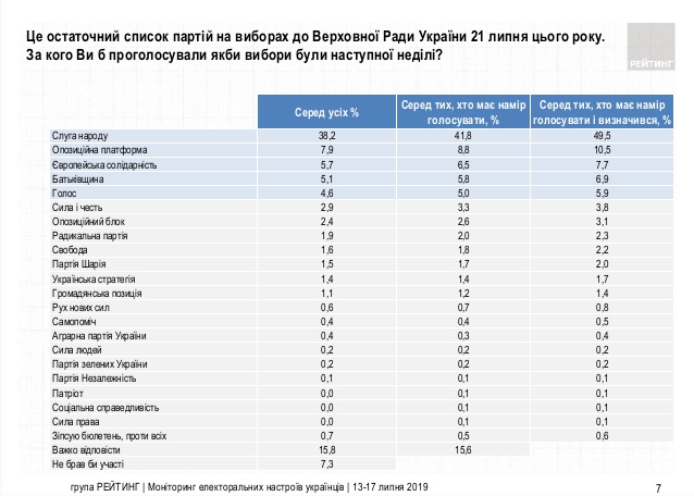 Группа "Рейтинг" тоже отмечает рост показателя партии Зеленского, но куда более серьезный: 49,5% (еще 10 июля эта служба фиксировала 47%).