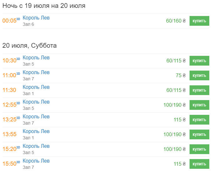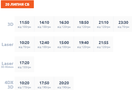 18 июля начала показа в кинотеатре - с 14:40. Стоимость билетов - от 100 до 200 грн. (до 18:55). Вечерние сеансы будут стоит дороже - в 19:15 за билеты Lux - 260 грн, в 19:20 - 220 грн, в 20:05 - от 120 грн., в 20:30 - от 110 грн. Сеансы оканчиваются в 23:45. После 23:00 билет будет стоить 60 грн.