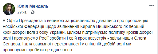 "В Офисе президента с большим интересом узнали о предложении Российской Федерации об освобождении Кирилла Вышинского как первый шаг доброй воли со стороны Украины. Полностью поддерживаем политику шагов доброй воли и предлагаем России сделать и свой шаг навстречу – освободив Олега Сенцова. И для взаимной уверенности в общей доброй воле мы предлагаем сделать это одновременно", - написала на своей странице в Facebook пресс-секретарь Зеленского Юлия Мендель.