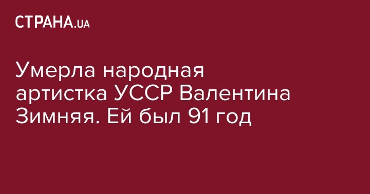 Народная артистка УССР, известная актриса и театральный педагог Валентина Зимняя умерла в Киеве. Ей был 91 год. Об этом сообщил глава Минкульта Евгений Нищук вечером в четверг, 18 июля.