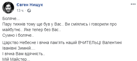 "Царство Небесное и вечная память нашей учительнице Валентине Ивановне Зимний... И вечная Вам благодарность... Мой Мастер...", - говорится на его fb-странице.