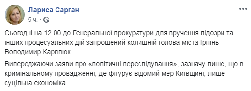 "Сегодня на 12:00 в Генеральную прокуратуру для вручения подозрения и других процессуальных действий приглашен бывший глава города Ирпень Владимир Карплюк", - говорится в опубликованном сообщении.